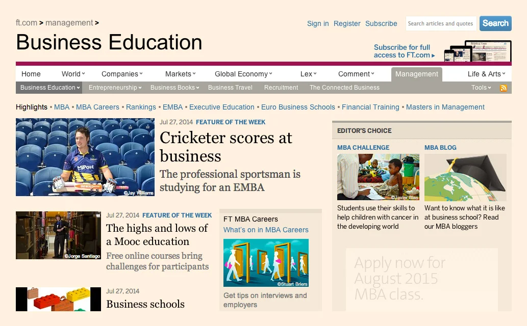 It may seem like “Business Education” is merely shorthand for the FT’s mission statement, but in fact, what we have is a nearly perfect digital news product. Clearly the result of much time and resources, this product/hub/section of FT.com is so replete with strong content examples for revenue, brand and UX that it is well worth the visit for anyone developing a product of any size or purpose.